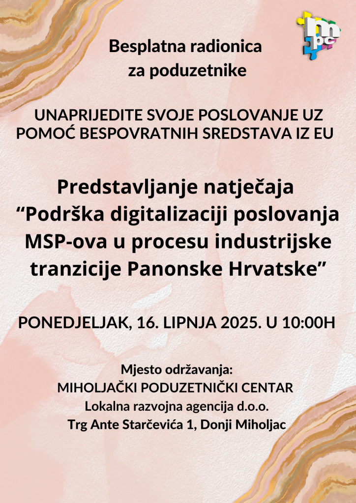 Radionica će se održati 16. lipnja 2025. godine (ponedjeljak) u 10:00h u MIHOLJAČKOM PODUZETNIČKOM CENTRU Lokalnoj razvojnoj agenciji d.o.o. , Trg Ante Starčevića 1.